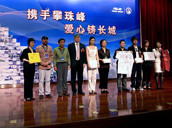 | 5月19日,以“攜手攀珠峰,愛心鑄長城”為主題的“中國登山英雄載譽(yù)歸來暨華碩志愿者凱旋賑災(zāi)媒體見面會(huì)”在北京召開。在珠峰完成火炬?zhèn)鬟f的王勇峰、黃春貴、次落、景陽等四位登山英雄在會(huì)上與媒體見面,并當(dāng)場(chǎng)為四川地震災(zāi)區(qū)舉行義賣捐獻(xiàn)活動(dòng),號(hào)召更多的人和災(zāi)區(qū)同胞并肩攜手,在珠峰精神的感召和鼓舞下,勇敢地抗擊災(zāi)害。 |