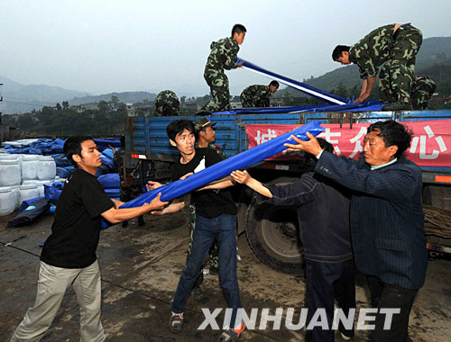 當(dāng)日,首批聯(lián)合國捐贈的320頂帳篷運抵四川汶川水磨鎮(zhèn)。