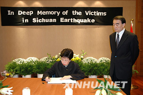 5月20日,在瑞士日內(nèi)瓦,世界衛(wèi)生組織總干事陳馮富珍前往中國(guó)常駐日內(nèi)瓦聯(lián)合國(guó)代表團(tuán)駐地,吊唁中國(guó)汶川大地震遇難者,并稱贊中國(guó)的救災(zāi)工作高效透明。