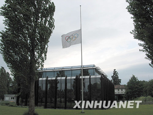 5月20日,瑞士洛桑國(guó)際奧委會(huì)總部前的五環(huán)旗降半旗向中國(guó)汶川大地震遇難者志哀。