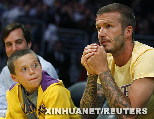 5月21日,洛杉磯銀河足球隊球員貝克漢姆(右)與他的兒子布魯克林在場邊觀看湖人隊的比賽。