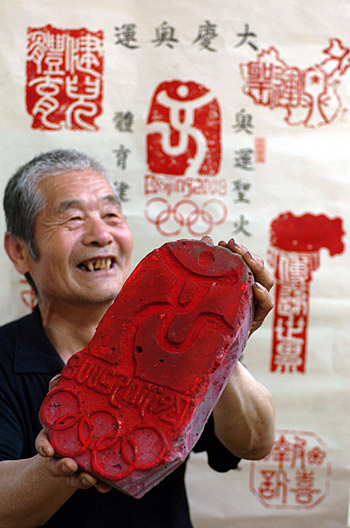 山東省淄博市臨淄區(qū)梧臺(tái)鎮(zhèn)王青村的七旬老人王天德歷時(shí)一年半,用八塊青磚刻制的大型組合“奧運(yùn)情”刻章于近日完成。老人精心打磨的這八塊印章中包括“奧運(yùn)圣火傳遞世界報(bào)喜訊、體育健兒志在全球創(chuàng)輝煌”等內(nèi)容。 這是王天德老人在展示用青磚刻制好的“中國印”。