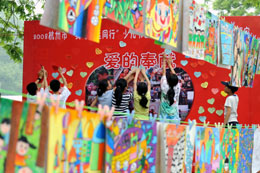 5月25日,小朋友把寫有給災(zāi)區(qū)孩子寄語(yǔ)的紙條貼在簽名墻上。當(dāng)日,杭州市舉辦“我與奧運(yùn)同行”少兒書畫攝影創(chuàng)意大賽優(yōu)秀作品展示暨賑災(zāi)義賣活動(dòng),近500幅參賽作品和部分獲獎(jiǎng)選手現(xiàn)場(chǎng)創(chuàng)作的作品參加義賣,所得款項(xiàng)將捐給四川地震災(zāi)區(qū)的孩子。