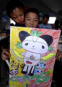 一名小學(xué)生在位于綿陽(yáng)市九洲體育館的帳篷小學(xué)內(nèi)展示自己創(chuàng)作的以?shī)W運(yùn)為題材的繪畫作品。