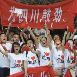 5月23日,群眾沿途為災(zāi)區(qū)人民鼓勁。當(dāng)日,北京奧運(yùn)會(huì)圣火在上海傳遞。