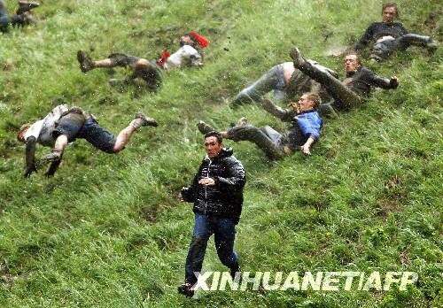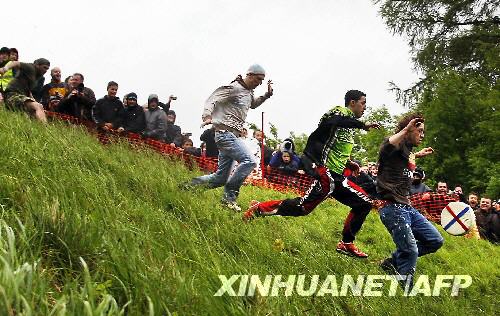 5月26日,在英國格洛斯特郡庫珀山舉行的滾奶酪比賽上,參賽者奔跑追逐從山坡上滾下的巨型奶酪,最先追到者獲勝。一年一度的滾奶酪比賽是英國格洛斯特郡的一項傳統(tǒng)賽事,至今已有200多年歷史,但由于山坡陡峭光滑,比賽中常有人受傷。 新華社/法新