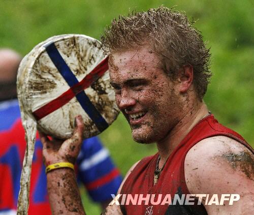 5月26日,在英國格洛斯特郡庫珀山舉行的滾奶酪比賽上,滿身泥濘的獲勝者展示追到的奶酪。新華社/法新