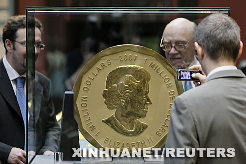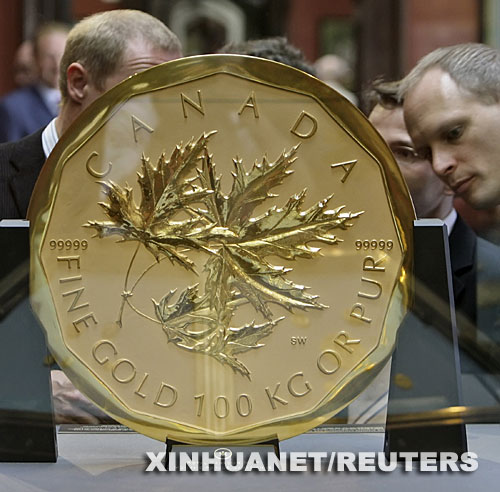 這枚金幣純度達(dá)99.999%,面值為100萬加元(約合100萬美元)。這種厚3厘米、直徑為53厘米、重達(dá)100公斤的巨無霸加拿大楓葉金幣,目前全世界僅有5枚。 新華社/路透