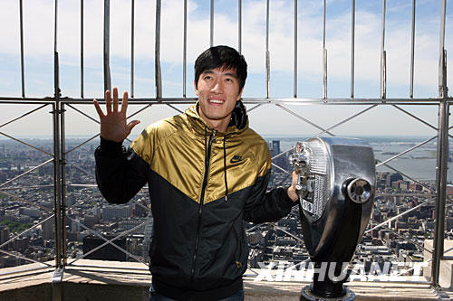 5月28日,在美國紐約帝國大廈86層觀景平臺,劉翔擺出跨欄姿勢供媒體拍攝。當日,劉翔在紐約出席田徑大獎賽記者見面會。第四屆銳步田徑大獎賽將于5月31日在紐約舉行。