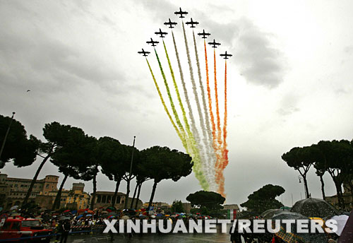 6月2日,在意大利首都羅馬的圓形大劇場上空,意大利空軍表演特技飛行。當日是意大利國慶日,意大利舉行盛大閱兵儀式慶祝國慶。 新華社/路透
