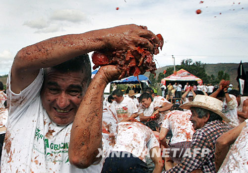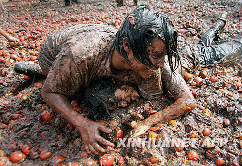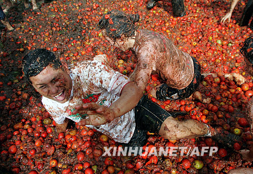 6月1日,在哥倫比亞博亞卡省蘇塔馬錢市舉行的第四屆西紅柿狂歡節(jié)上,兩名年輕人盡情狂歡。今年狂歡節(jié)的組織方共準(zhǔn)備了10噸西紅柿供大家狂歡。 新華社/法新