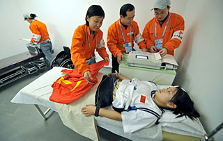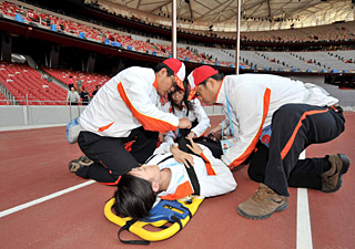 | 志愿者在“鳥(niǎo)巢”內(nèi)進(jìn)行醫(yī)療救護(hù)演練。新華社記者 羅曉光