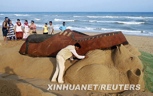 這座沙雕以一只皮鞋踩在北極熊身上為造型,寓意皮革工業(yè)會破壞環(huán)境。帕特奈克是為迎接6月5日世界環(huán)境日而進行此項創(chuàng)作的。 新華社/路透