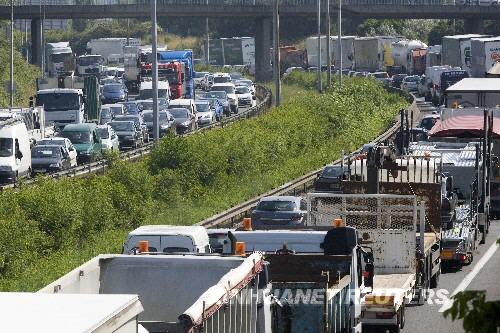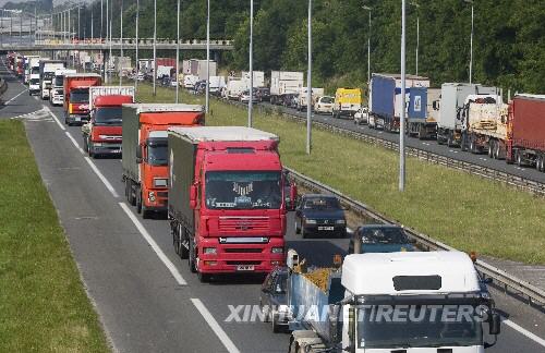 6月9日,在法國西南部城市波爾多,大批卡車排起長龍堵塞交通,以抗議日益上漲的油價。 新華社/路透