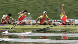 6月1日,中國(guó)隊(duì)選手黃鐘鳴、吳崇魁、張林、田軍(從左至右)在賽艇世界杯瑞士盧塞恩站男子輕量級(jí)四人單槳決賽中奪得冠軍。新華社/路透 | 5金1銀3銅,這是中國(guó)賽艇隊(duì)在2008年第二站世界杯瑞士盧塞恩站的成績(jī)。 盡管包括國(guó)際賽艇聯(lián)合會(huì)官方網(wǎng)站在內(nèi)的外國(guó)媒體開(kāi)始用“powerhouse”(強(qiáng)手、霸主)來(lái)形容中國(guó)隊(duì),但中國(guó)隊(duì)領(lǐng)隊(duì)曹景偉分析說(shuō):5枚世界杯金牌說(shuō)明不了什么。