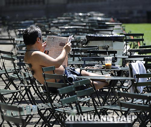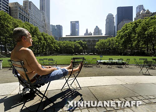 6月9日,在美國(guó)紐約布賴恩特公園,一名男子赤裸上身坐在曬得滾燙的椅子上。新華社/法新
