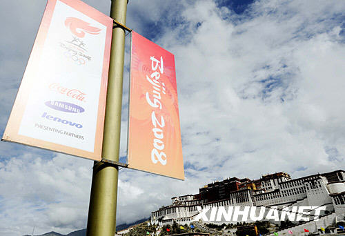 這是6月17日拍攝的懸掛在布達(dá)拉宮廣場前的奧運(yùn)圣火傳遞的宣傳板。北京奧運(yùn)圣火將于6月21日在西藏自治區(qū)首府拉薩傳遞。