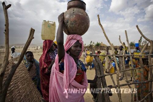 6月19日,在乍得東部的一個難民營,來自達(dá)爾富爾地區(qū)的幾名難民頂著罐子前往井中取水。 新華社/路透
