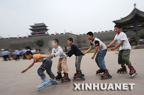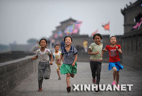 6月22日,小朋友們在平遙古城的城墻上進行賽跑。