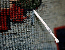 三塊看似平常的手工編織地毯,絨面平整,底面編織均勻,破拆后發(fā)現(xiàn)其中穿插織入了許多細(xì)長(zhǎng)的柱狀針織物,剝開它們最外層的羊毛纖維,里面是一根直徑約