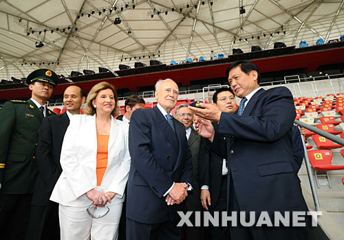 6月24日,正在中國(guó)進(jìn)行國(guó)事訪問(wèn)的希臘總統(tǒng)帕普利亞斯在中共中央政治局委員、北京市委書(shū)記、北京奧組委主席劉淇的陪同下參觀國(guó)家體育場(chǎng)——“鳥(niǎo)巢”。