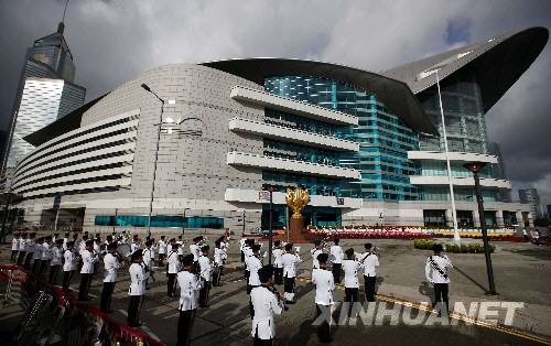 7月1日,五星紅旗在香港特別行政區(qū)區(qū)旗的伴隨下升起。