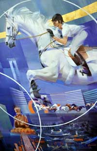 6月29日,繼《喝彩—中國奧運(yùn)百年圓夢》《北京千年城市風(fēng)景畫》后,澳大利亞著名奧運(yùn)畫家查爾斯·比利奇又一幅力作《香港—2008》風(fēng)景畫亮相京城。畫作高1.2米、寬4.8米,以香港作為2008年奧運(yùn)會馬術(shù)運(yùn)動比賽地為主題。圖為作品局部。