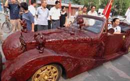 日前,開封青年雕刻家朱雪耗時兩年時間雕刻完成的“奧運(yùn)和諧號”藝術(shù)車在鄭州文廟廣場前展出。這臺以老爺車軀干為骨架的藝術(shù)車使用了1000公斤紅木,雕刻出雙龍、華表、天安門、奧運(yùn)五環(huán)、中國印以及福娃等中國元素和奧運(yùn)符號。