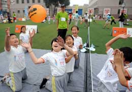 6月28日,社區(qū)小朋友在體驗殘奧項目坐式排球運(yùn)動。