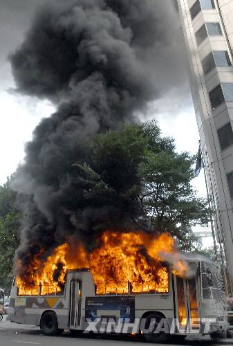 7月1日,在韓國首都首爾,一輛用來阻擋抗議隊伍的警車被抗議者點火焚燒。據(jù)官方數(shù)字統(tǒng)計,在持續(xù)數(shù)周的抗議活動中,共有111輛警車被毀,372名防暴警察受傷。 新華社/法新