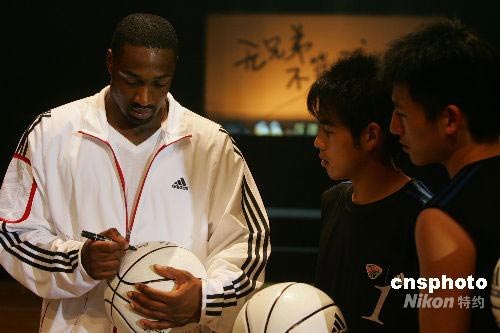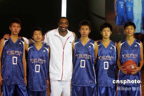 7月3日,NBA球星吉爾伯特·阿里納斯在上海出席阿迪達(dá)斯2008夏季籃球聯(lián)賽全國總決賽開幕式,一支來自汶川的高中籃球隊得到了吉爾伯特·阿里納斯的特別“照顧”,傳授球技、合影留念,吉爾伯特·阿里納斯(左三)和這些小球員來了個“親密接觸”。