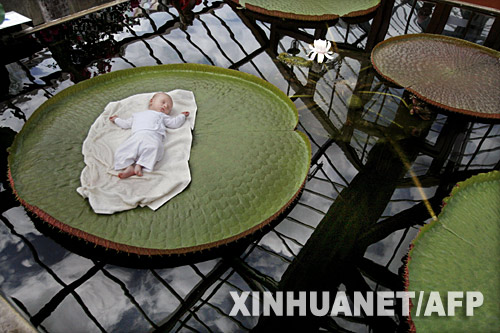 7月6日,在荷蘭烏得勒支的萊登大學(xué)植物園,一個熟睡的嬰兒被放在王蓮的葉子上。王蓮葉子的直徑可達1.5米,負重40公斤。 新華社/法新