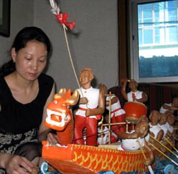 7月7日,陜西安康市新安職業(yè)中學女教師季夏對龍舟泥塑做最后的粘貼、完善。 季夏從小酷愛泥塑藝術,她耗時兩個月構思創(chuàng)作出泥塑作品《龍舟競技》,表達對奧運的期盼。