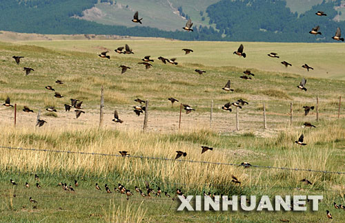成群的椋鳥在新疆巴里坤草原上捕食蝗蟲(6月12日攝)。