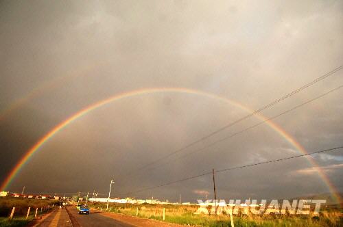 當(dāng)日晚7時(shí)30分左右,小雨過(guò)后,位于青海省海北藏族自治州的金銀灘草原上空出現(xiàn)罕見(jiàn)雙彩虹,顏色一深一淺,鮮艷奪目。
