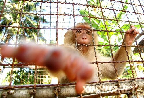 7月11日,在泰國南部素叻他尼府的蘇梅島,一只被關在籠里的猴子奮力地伸出手臂向路人乞食。