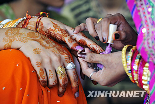 7月12日,在印度拉賈斯坦邦首府齋浦爾,準(zhǔn)新娘麗達(dá)爾的母親在訂婚儀式上為自己的女兒化妝。