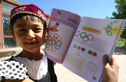 新疆哈密市天山鄉(xiāng)的少數(shù)民族小學(xué)生在展示剛領(lǐng)的《北京奧運(yùn)會(huì)小學(xué)生讀本》。