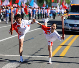 7月13日,火炬手徐銘(左)與火炬手方丹在交接后慶祝。當(dāng)日,北京奧運(yùn)火炬在黑龍江省齊齊哈爾市傳遞。