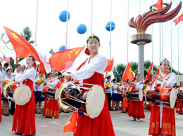 7月14日,演員們?cè)谄鹋軆x式現(xiàn)場(chǎng)進(jìn)行表演。當(dāng)日,北京奧運(yùn)圣火在吉林省長(zhǎng)春市傳遞。