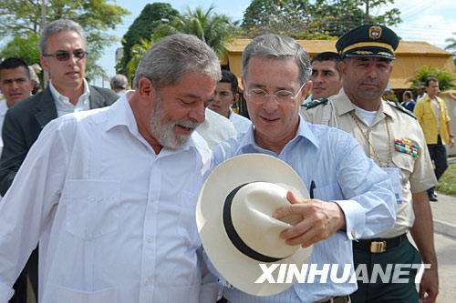 7月20日,在哥倫比亞萊蒂西亞,哥總統(tǒng)烏里韋(前右)和巴西總統(tǒng)盧拉(前左)共同出席慶祝活動(dòng)。當(dāng)天,哥倫比亞舉行閱兵等活動(dòng),慶祝獨(dú)立198周年。哥總統(tǒng)烏里韋主持閱兵儀式,巴西總統(tǒng)盧拉、秘魯總統(tǒng)加西亞應(yīng)邀出席。