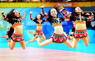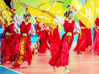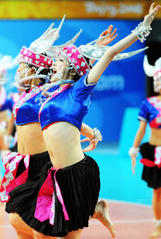 7月20日,志愿者們在進(jìn)行民族民間舞蹈表演。當(dāng)日,北京奧運會、殘奧會體育展示與頒獎儀式工作匯報暨誓師動員大會在北京理工大學(xué)體育館舉行,集中匯報展示了北京奧運會、殘奧會頒獎儀式服裝及頒獎儀式標(biāo)準(zhǔn)流程、競技拉拉操表演、民族民間舞蹈表演和吉祥物表演等項目。