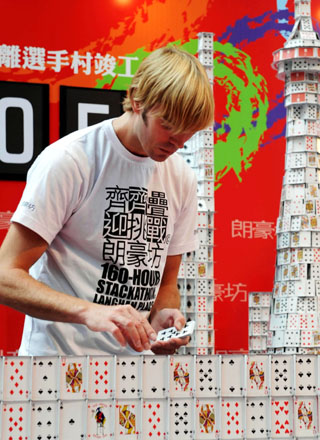 7月20日,美國藝術(shù)建筑師、吉尼斯世界紀(jì)錄保持者伯格在香港朗豪坊內(nèi)用紙牌搭建“奧運村”。他自7月5日起在香港朗豪坊進(jìn)行馬拉松式疊紙牌,徒手用14萬張紙牌搭出以北京奧運會為主題的紙牌建筑群,包括“鳥巢”“水立方”以及奧林匹克水上公園等,計劃于7月24日完工。