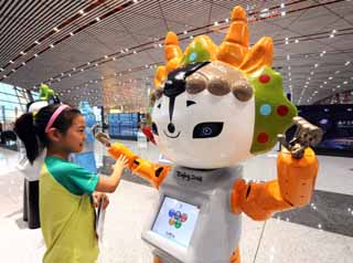在民航局及機場奧運團(tuán)隊支持下,由中國民航大學(xué)研制的五個奧運福娃機器人,亮相北京首都國際機場T3航站樓。奧運會期間,奧運福娃機器人將守候在北京首都國際機場,迎送到港離港的奧運大家庭成員和國內(nèi)外賓客。