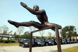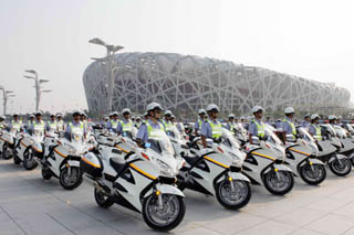 7月20日,北京奧運交通應(yīng)急小分隊在“鳥巢”前整裝待發(fā)。