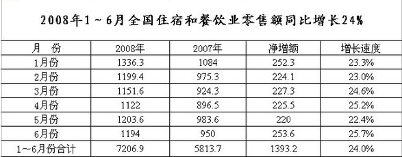 今年以來,全國住宿與餐飲業(yè)盡管受南方低溫雨雪冰凍、汶川大地震等嚴重自然災害以及物價上漲、勞動力成本提高的影響,企業(yè)經營出現一定程度的波動,但餐飲市場仍呈現出平穩(wěn)增長的良好態(tài)勢,預計全年餐飲市場仍將繼續(xù)保持快速發(fā)展。 據有關數據分析,上半年,全國住宿與餐飲市場持續(xù)高增長,零售額達到7207億元,同比增長24%,比上年同期加快6.2個百分點,占同期社會消費品零售總額的比重為14.1%,拉動社會消費品零售總額增長3.3個百分點。其中,6月份零售額實現1194億元,同比增長25.7%,環(huán)比下降0.8%,比上年同期加快7.2個百分點,比上月加快3.3個百分點。上半年住宿與餐飲業(yè)新設立外商投資企業(yè)338家,同比下降19.5%;合同外資金額14.1億美元,同比增長3.9%;實際使用外資金額5.1億美元,同比增長9.9%。其中,餐飲業(yè)實際使用外資金額2.2億美元,同比增長34.8%。 上半年餐飲市場主要特點:一是“農家樂”餐飲倍受青睞。首次出現的“五一”、“清明”兩個小長假,帶動“農家樂”休閑餐飲大幅增長,據監(jiān)測,農家樂餐飲消費同比增長達到30%。二是婚宴現象突出。據監(jiān)測,今年春節(jié)、“五一”等假期,一些大中城市婚宴消費增幅達到30%以上。 根據餐飲市場運行規(guī)律,預測下半年餐飲市場快速增長的勢頭不會改變,特別是在第三季度,隨著北京奧運會的舉辦,全國住宿和餐飲消費需求有望明顯增加。預計第三季度住宿與餐飲業(yè)零售額將達到3800億元,同比增長24.7%;全年住宿與餐飲業(yè)零售額將達到15380億元,同比增長24.5%;全國人均餐飲消費支出將達到1158元,同比增長23.9%。