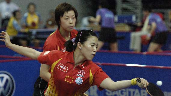 2006年6月16日,中國選手王楠(前)/張怡寧在女子雙打首輪比賽中以4比1戰(zhàn)勝韓國選手李恩實/文炫晶。當日,2006年中國乒乓球公開賽在江蘇昆山繼續(xù)進行。新華社發(fā)