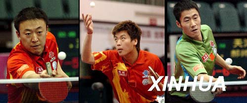 2007年3月25日,中國乒乓球男隊“直通薩格勒布”世乒賽選拔賽第二階段的比賽在遼寧錦州結束。首批6名獲得參賽資格的選手分別是馬琳(左)、郝帥(中)、王勵勤(右)、馬龍、王皓和張超。新華社發(fā)