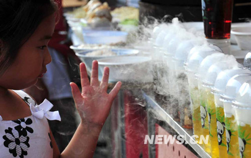 這位小姑娘對(duì)北京王府井小吃街上的“泡泡茶”冒出的氣泡非常好奇(7月29日攝)。