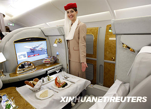 8月1日,在美國紐約肯尼迪國際機(jī)場,阿聯(lián)酋航空公司的空姐展示首航后的空中客車A380客機(jī)頭等艙。新華社/路透